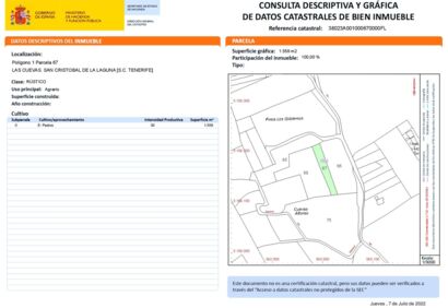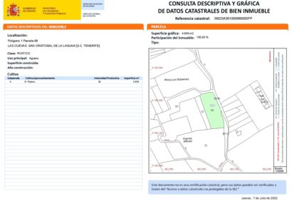 Großes, rustikales Grundstück für landwirtschaftliche Nutzung. Das Grundstück ist komplett eingefriedet und ummauert. Es liegt klimatisch ideal auf nur 120 Meter Höhenlage im Valle Guerra einer sehr fruchtbaren Gegend. Es werden dort im Umfeld im großen Stil Blumen, Kartoffeln und auch Wein produziert. Das Grundstück hat eine gute Zuwegung und ein großes abschließbares Einfahrtstor.